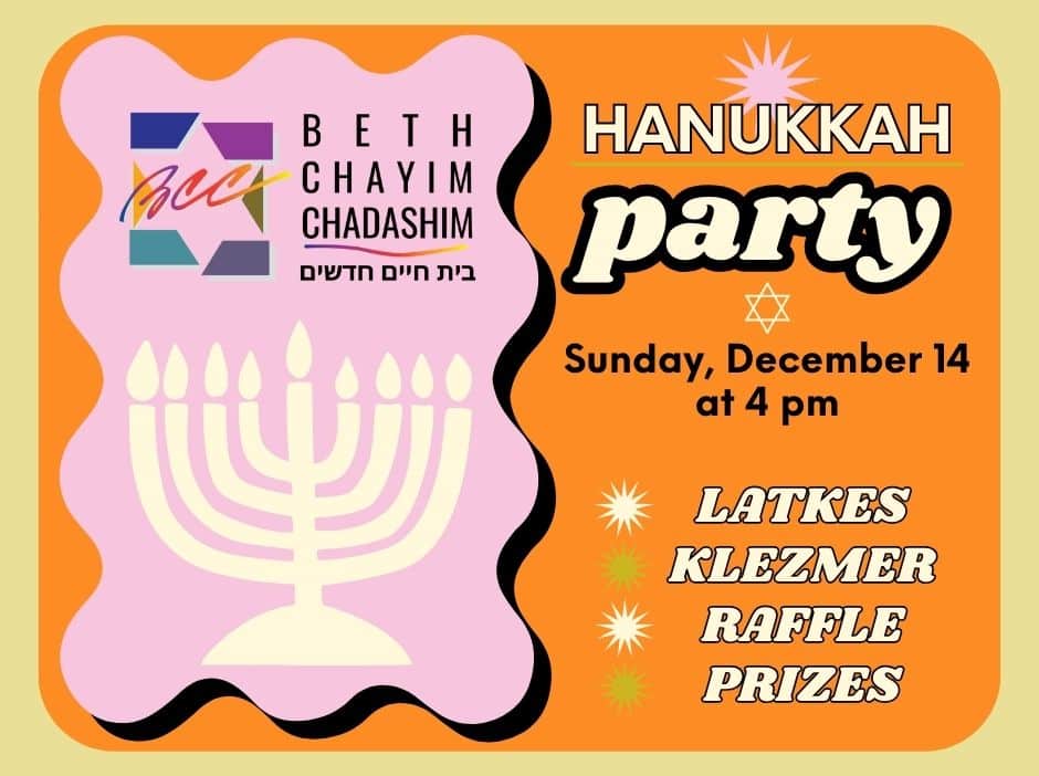 Join Beth Chayim Chadashim for our annual Hanukkah party! Look forward to candle lighting (bring your menorahs!), raffle prizes, loads of latkes, and live music from the Klezmer band Gay Gezunt!